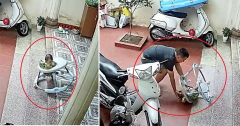Đoạn clip ghi lại hình ảnh cháu bé ngồi trong xe tròn tập đi bị ngã qua bậc tam cấp xuống sân,… Chi tiết Thót tim xem ông bố ‘siêu nhân’ cứu con gái thoát nạn khi ngã xe tròn tập đi