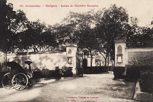 Cổng chính nghĩa trang trên đường Legrand de la Liraye (nay là Điện Biên Phủ) lúc vừa được người Pháp xây dựng ở vị trí công viên Lê Văn Tám ngày nay. Ảnh tư liệu