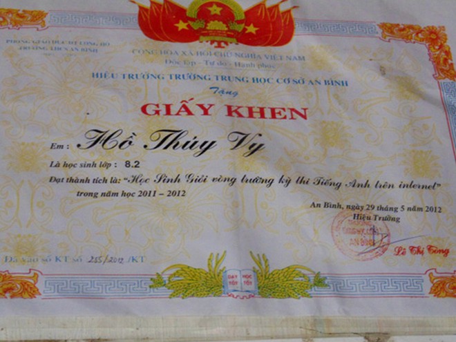 Mặc dù không ăn được cơm, song cô bé Thúy Vy học rất giỏi và “tài lẻ” văn nghệ cũng khiến nhiều người “ngã mũ”… Bên góc học tập trong căn nhà nhỏ của Vy, treo đầy bằng khen, giấy khen thành tích học tập và các giải thưởng về ca hát.