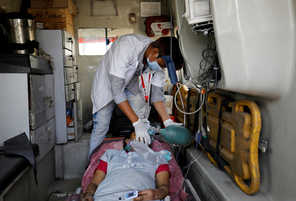 Bệ.nh nh.ân CO.VID-19 th.ở o.xy trong lúc xe cấ.p c.ứu phải xếp hàng chờ được vào bện.h v.iện ở thành phố Ahmedabad, bang Gujarat, ngày 14-4 – Ảnh: REUTERS