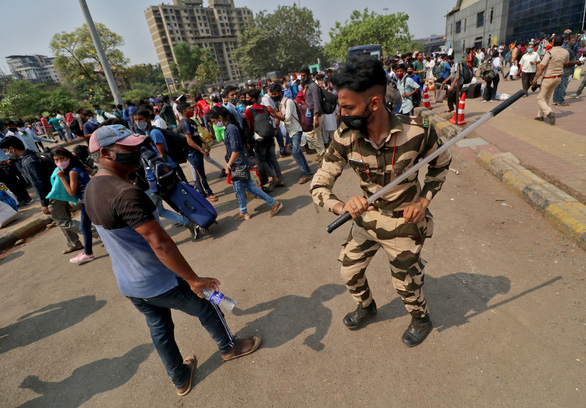 Lực lượng an ninh dùng gậy để đảm bảo người dân tuân thủ các quy tắc phòng dị.ch tại Mumbai ngày 14-4 – Ảnh: REUTERS