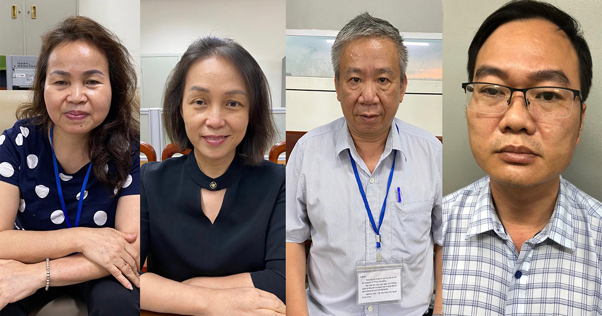 Các bị can trong vụ án (từ trái qua): Hoàng Thị Ngọc Hưởng, Nguyễn Thị Dung Hạnh, Đoàn Trọng Bình và Nghiêm Tuấn Linh