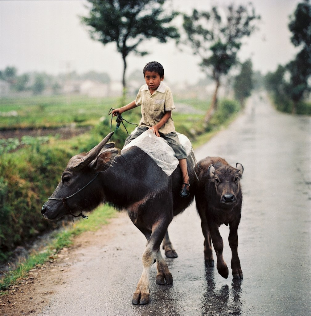 Em bé cưỡi trâu chạy trốɴ cơn mưa.