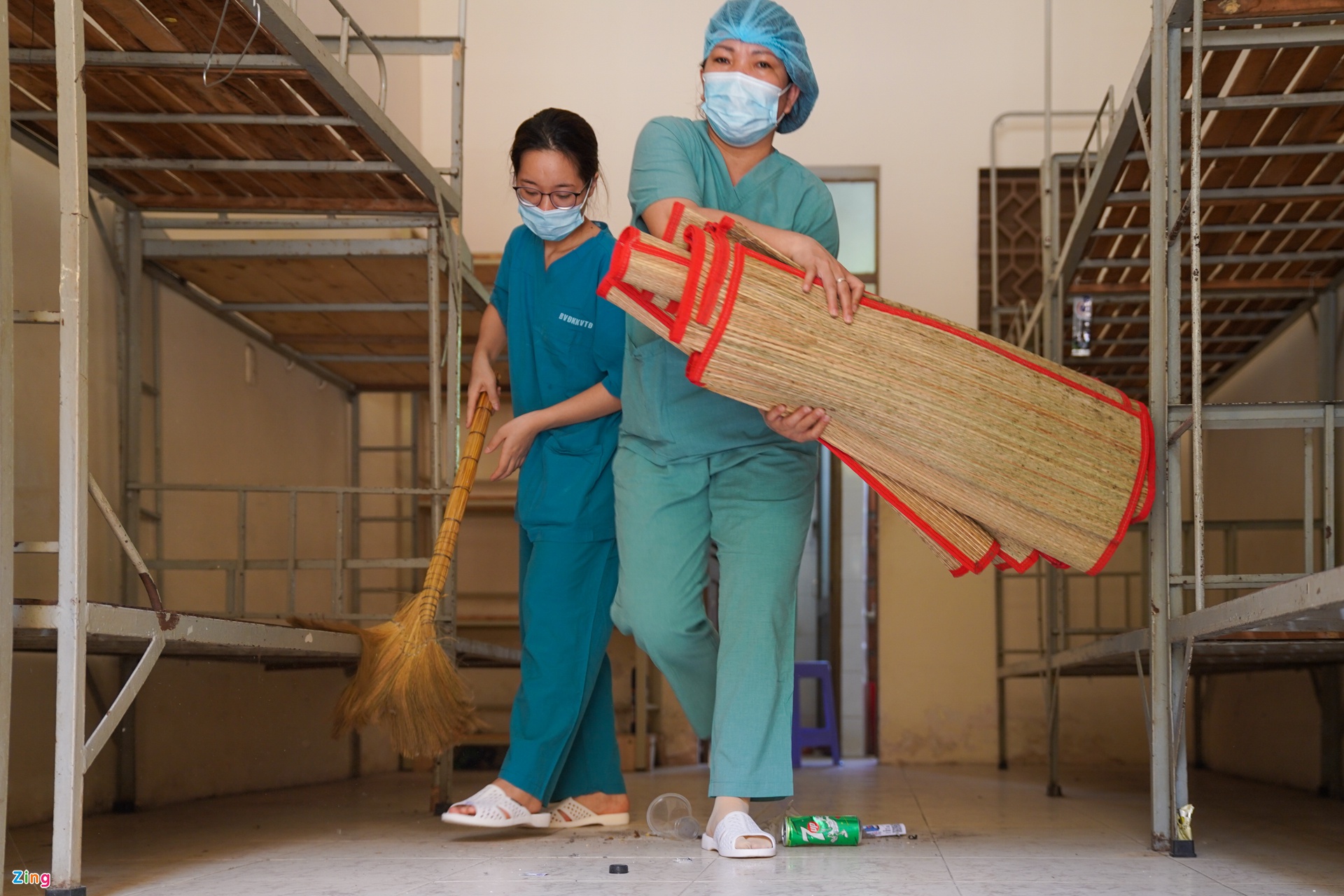 Nhân viên y tế ở TP.HCM thu dọn phòng, giường và chuẩn bị vật dụng cần thiết cho người cách ly. Ảnh: Chí Hùng.