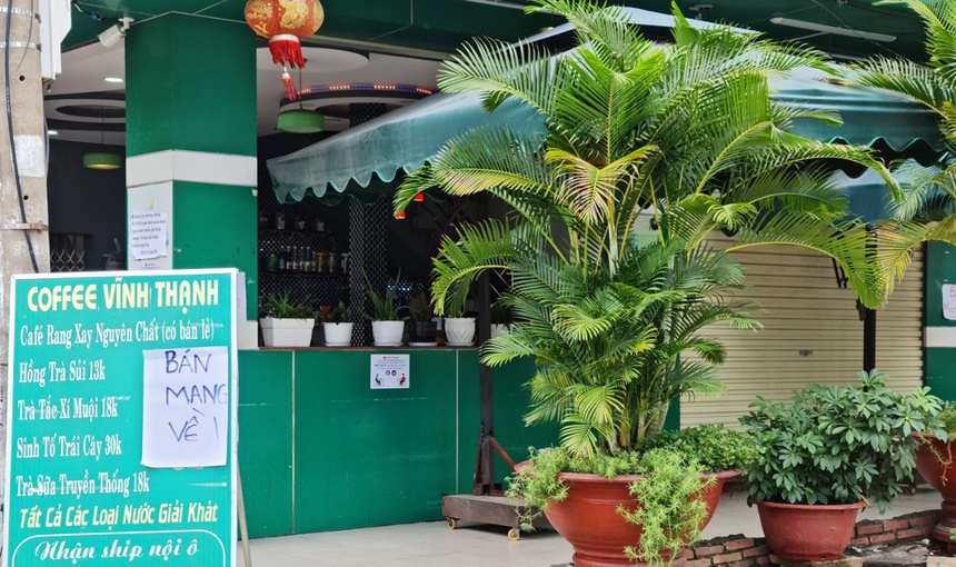 Sáng 6/7, nhiều hàng quán ở Sóc Trăng treo thông báo chỉ bán mang về. Ảnh: Việt Tường.