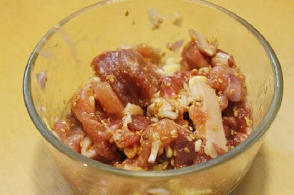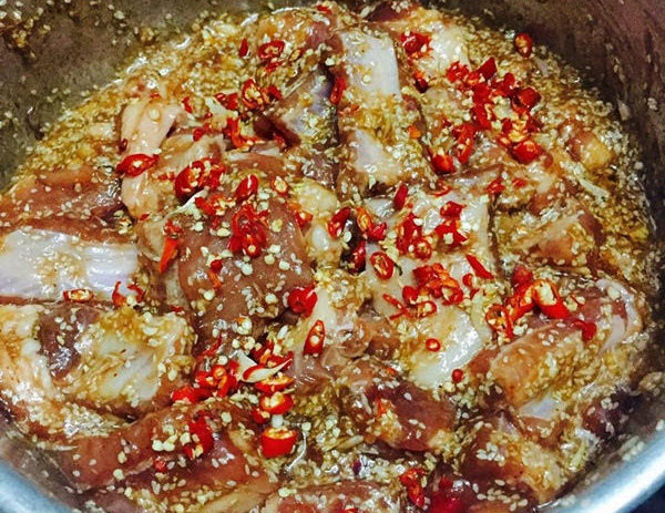 Thịt ba chỉ rửa sạch, để ráo nước sau đó thái thành miếng nhỏ vừa ăn. Bạn tiến hành pha hỗn hợp ướp thịt bao gồm: Riềng, sả, nghệ, tỏi, hành tím xay nhuyễn cùng chút hạt tiêu, mè trắng. Sau khi xay xong, bạn thêm nước tương, nước mắm, dầu ăn, dầu hào và trộn đều, tiến hành ướp thịt trong vòng 30-45 phút cho ngấm gia vị.