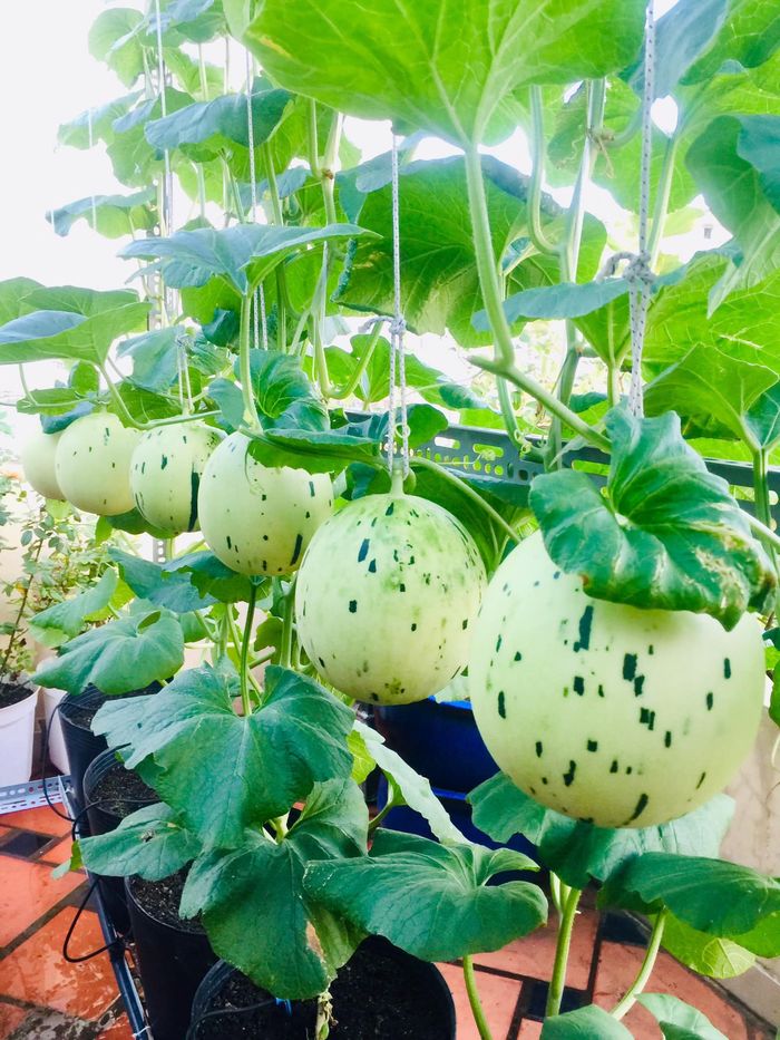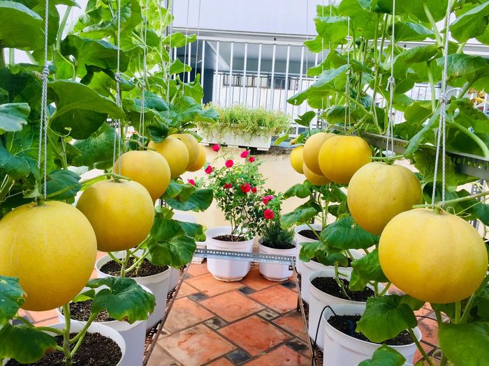 Khu vườn trên sân thượng của chị Ánh được chia thành nhiều khu vực, bên trên là trồng dây leo, bên dưới là trồng rau và hoa. Chị Ánh nghiên cứu trồng nhiều loại thực phẩm để gia đình có thể sử dụng luân phiên, đặc biệt chị trồng khá nhiều dưa vì nhanh cho trái, ăn ngọt, mát, là món khoái khẩu của gia đình. Không chỉ trồng giống dưa của Việt Nam, chị còn mua thêm giống dưa của Nhật Bản, Hàn Quốc để đa dạng hơn.