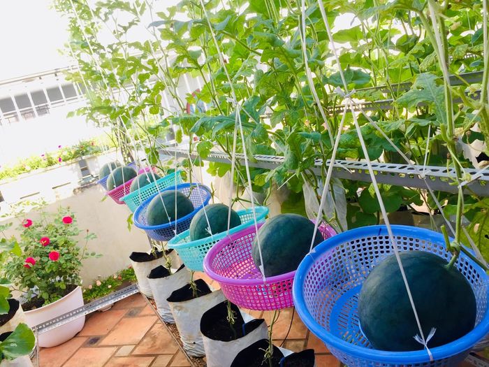 Khu vườn trên sân thượng của chị Ánh được chia thành nhiều khu vực, bên trên là trồng dây leo, bên dưới là trồng rau và hoa. Chị Ánh nghiên cứu trồng nhiều loại thực phẩm để gia đình có thể sử dụng luân phiên, đặc biệt chị trồng khá nhiều dưa vì nhanh cho trái, ăn ngọt, mát, là món khoái khẩu của gia đình. Không chỉ trồng giống dưa của Việt Nam, chị còn mua thêm giống dưa của Nhật Bản, Hàn Quốc để đa dạng hơn.