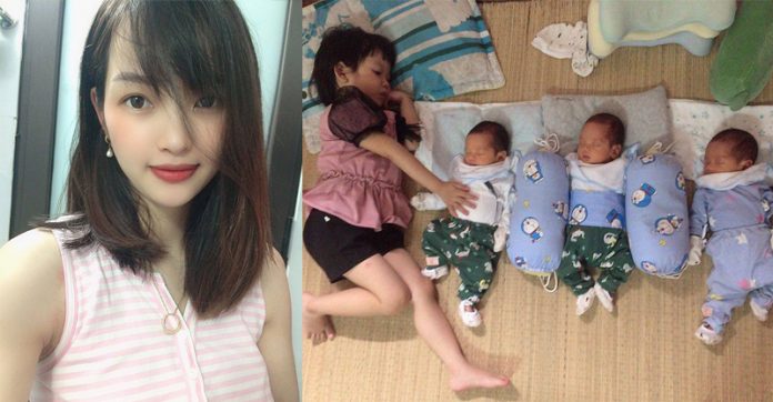 Thương lấy tay vén vội tóc cười rồi nói: “Sinh 3 vất vả lắm, cái gì cũng cùng một lúc đôi khi mình phải quay chóng mặt. Thế nhưng nhìn 3 con vui lắm”.