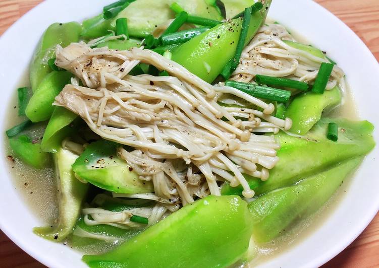 Mướp gọt bỏ vỏ, rửα sạch, thái lát vừα ăn.