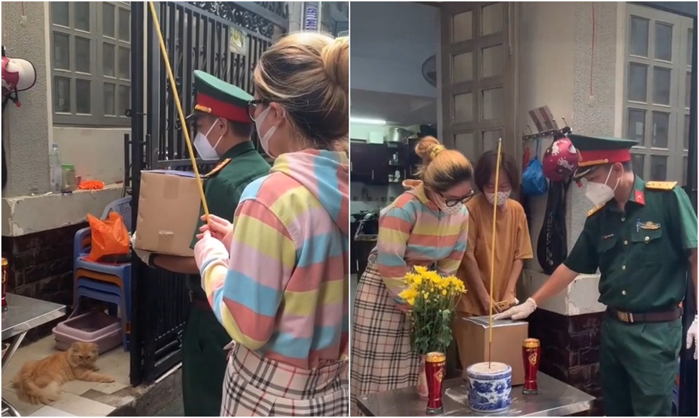 Suốt quãng đường từ đầu hẻm vào đến nhà, anh đã lấy mũ của mình đặt lên chiếc thùng, dường như muốn “che nắng” cho người không may mắn. Theo sau người chiến sĩ là một người phụ nữ cầm cây nhang.