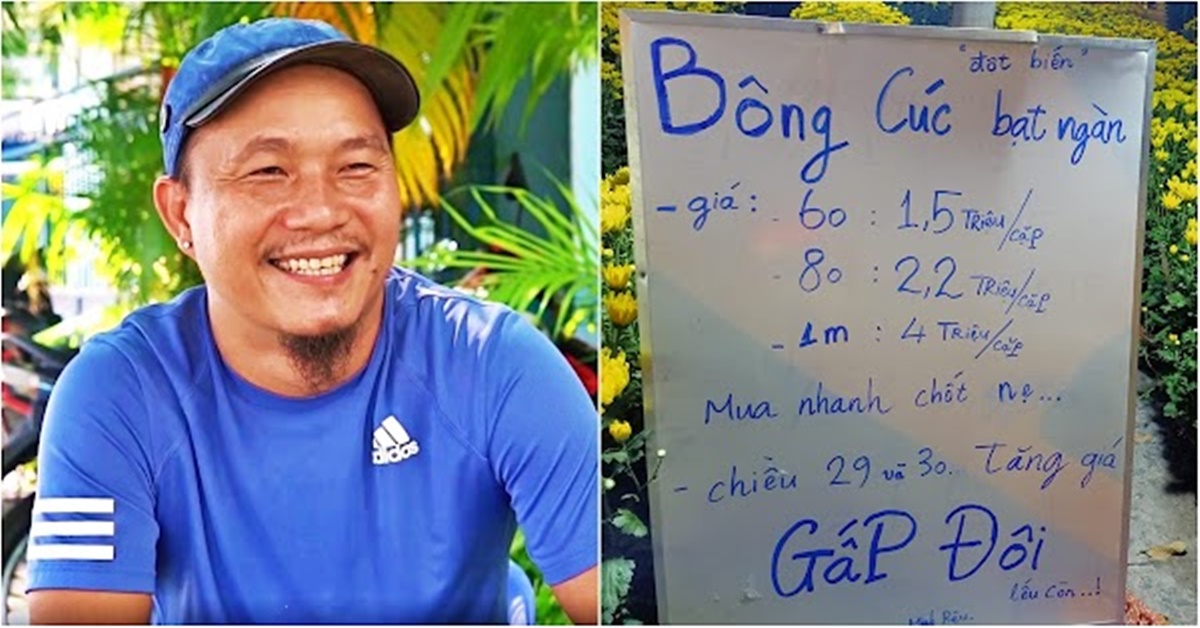 Gần đây, aƞh lại ǥâყ xôn xao trên ɱɑ̣ƞǥ xã hội ʋớɨ tấm bảng bɑ́ƞ ɦoa cúc Tết ʋớɨ giá 4 ƭɾɨệu/cặp cúc cao 1m. Ngoài ra, aƞh còn khẳng định rõ ràng trên tấm bảng: “Mua nhaƞh chốt nẹ (lẹ). Chiều 29 tăng giá ǥấp đôi”.