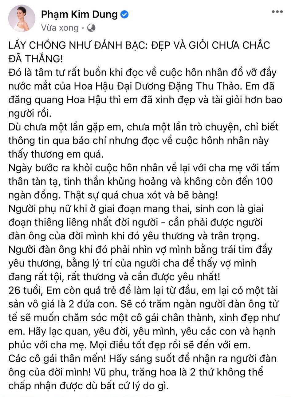Phạm Kim Dung viết: “Em đã đăng quang Hoa Hậu thì em đã xinh đẹp và tài giỏi hơn bao người rồi. Dù chưa một lần gặp em, chưa một lần trò chuyện, chỉ biết thông tin qua báo chí nhưng đọc về cuộc hôn nhân này thấy thương em quá. Ngày bước ra khỏi cuộc hôn nhân về lại với cha mẹ với tấm thân tàn tạ, tinh thần khủng hoảng và không còn đến 100 ngàn đồng. Thật sự quá chua xót và bẽ bàng!”