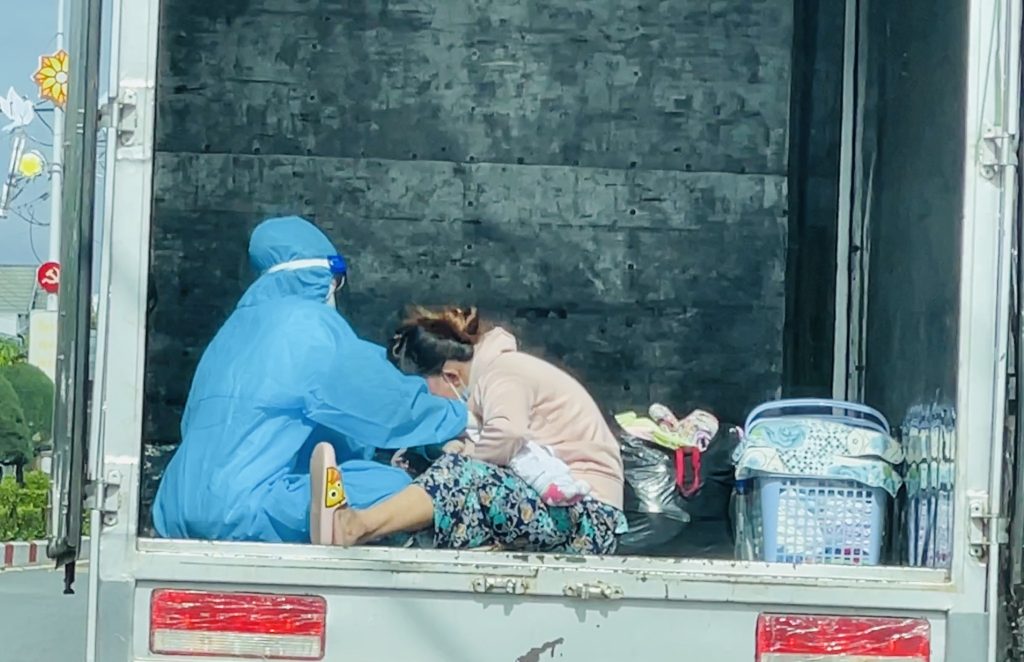 Bác sĩ Linh chăm sóc cháu bé trên thùng xe tải ĐỖ TRƯỜNG