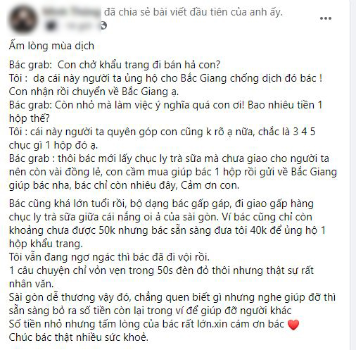 Bác cũng khá lớn tuổi rồi, bộ dạng bác gấp gáp, đi giao gấp hàng chục ly trà sữa giữa cái nắng oi ả của Sài Gòn. Ví bác cũng chỉ còn khoảng chưa được 50k nhưng bác sẵn sàng đưa tôi 40k để ủng hộ 1 hộp khẩu trang.