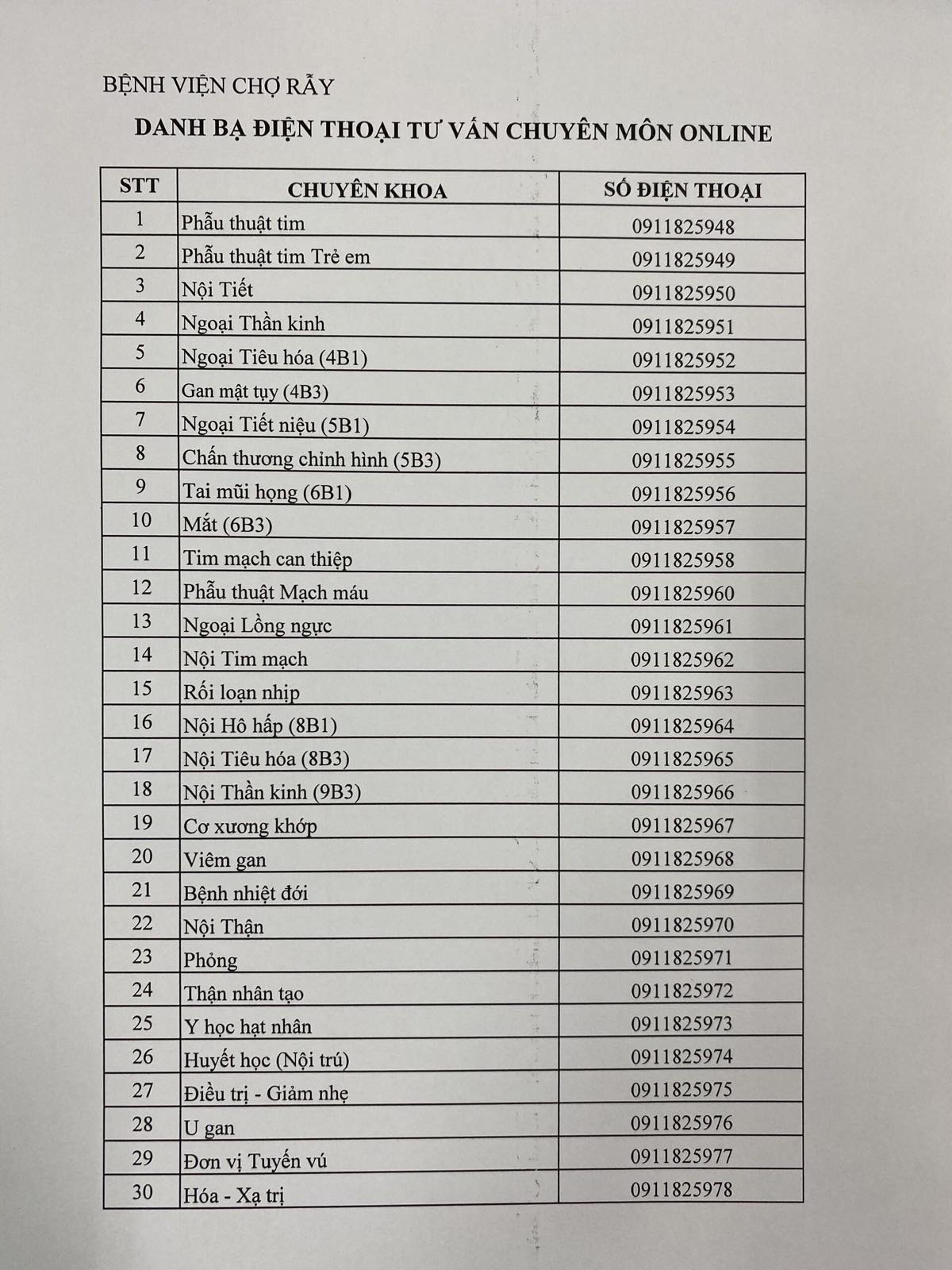 Khuya 11.8, Bệnh viện Chợ Rẫy TP.HCM đã triển khai 30 số điện thoại nhằm tư vấn, khám bệnh online cho bệnh nhân (không phải bệnh nhân Covid -19). Việc thực hiện sẽ bắt đầu từ 9 giờ sáng nay, 12.8.