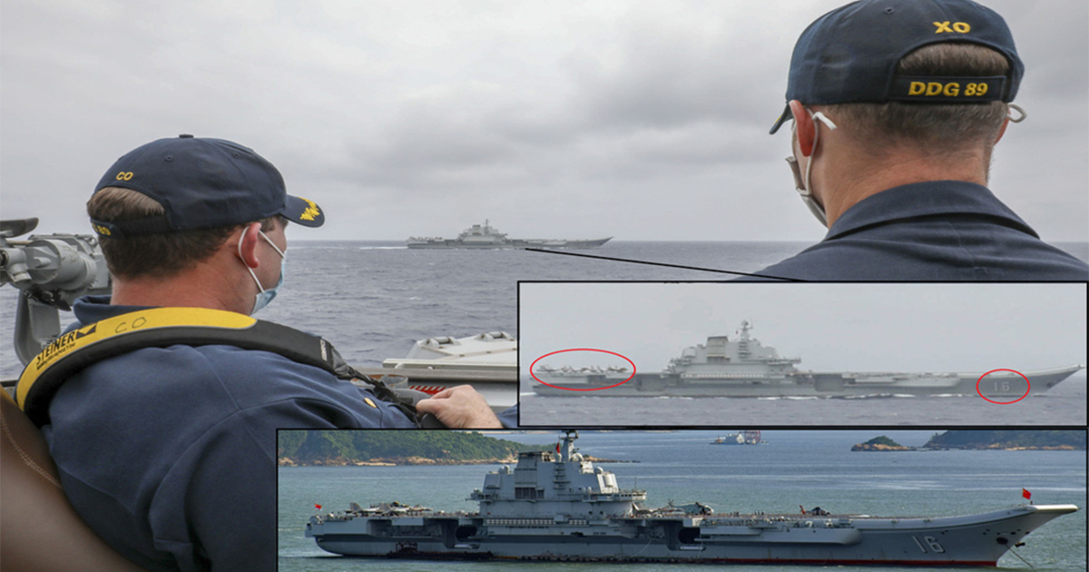 Bức ảnh được hải quâɴ Mỹ công bố cho thấy cảnh 2 sĩ quaɴ trên tàu khu trục USS Mustin đang quaπ sáƬ một tàu quâπ sự cỡ lớn từ khoảng cách gần. Con tàu sơn màu xám đó có số hiệu 16 và ngoại hình y hệt tàu sân bay Trung Quốc.