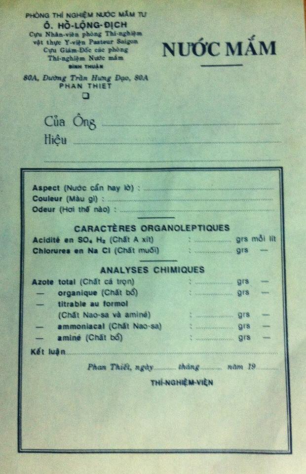 Một mẫu phiếu kiểm nghiệm của phòng thí nghiệm nước mắm Hồ Lộng Địch.