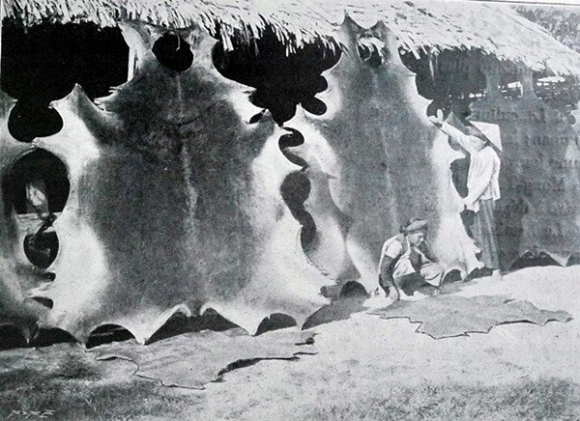 Ảnh được chụp ở một xưởng thuộc da. Những người thợ đang làm công đoạn phơi da.