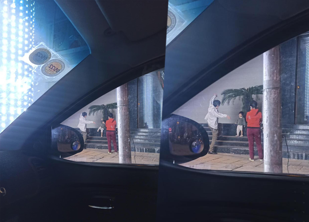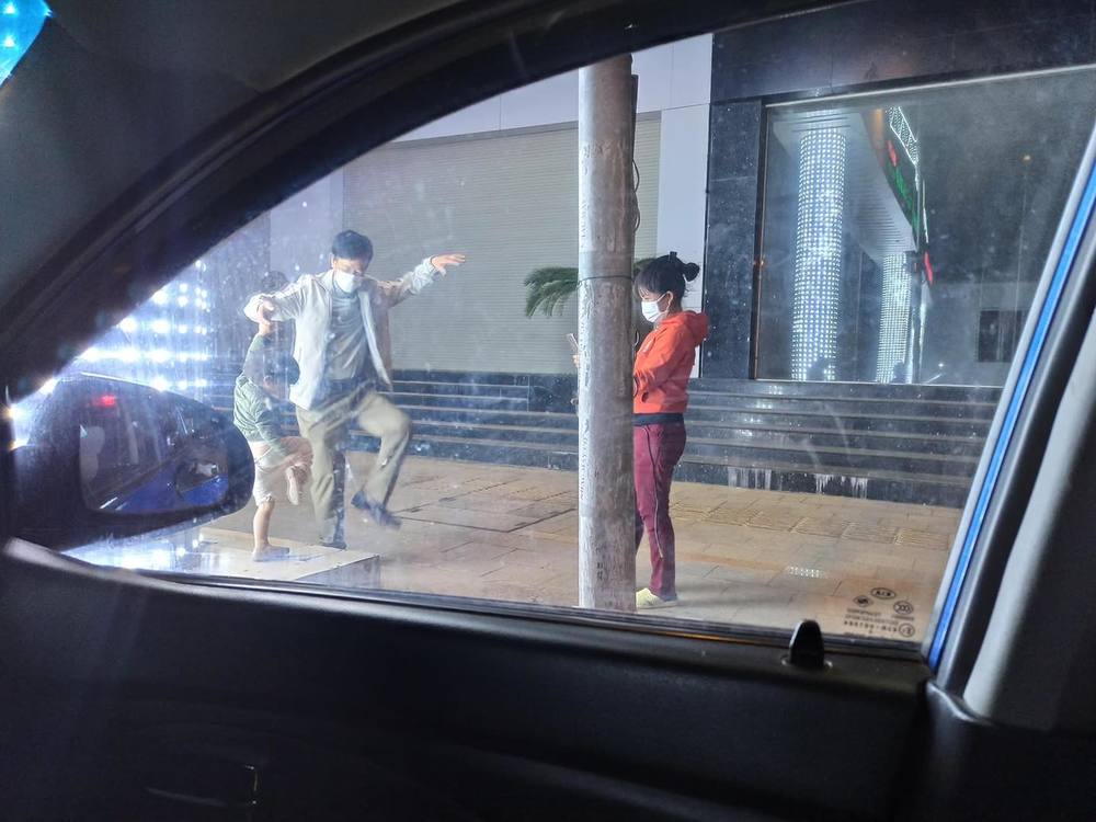 Trong bức ảnh, khi người bố cùng con trai nhảy múa thì mẹ đứng bên cạnh vui vẻ chụp lại giây phút đáng yêu đó. Đặc biệt, những khoảnh khắc này lại được chụp từ góc nhìn của một người đang ngồi trên xe ô tô.