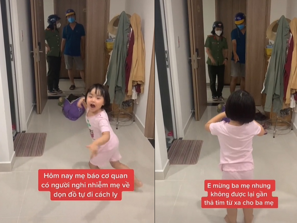Trước đó, dân mạng cũng từng “trụy tim” khi xem qua đoạn clip của một bé gái đáng yêu, múa hát khi gặp bố mẹ. Cụ thể, do dịch bùng phát nên bố mẹ của cô bé đều phải tham gia hỗ trợ chống dịch.