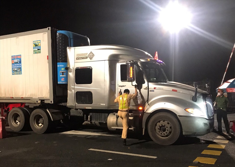 Xe container chở hàng do đối tượng Vũ Văn Phúc điều khiển sử dụng giấy xét nghiệm COVID-19 giả để qua mắt lực lượng chức năng tại chốt kiểm soát dịch bệnh cầu Bạch Đằng vào tỉnh Quảng Ninh. Ảnh: CAQN