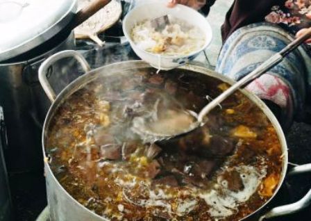 Đặc điểm chung là người ta chỉ tập trung vào xì xụp ăn thôi, vừa ăn vừa thưởng thức vị nước dùng đặc biệt, chẳng cần phải nghĩ ngợi gì về cả một thế giới xô bồ nằm cách mình ngay chỉ vài bước chân. Đã vào quán là tập trung ăn, tập trung thỏa mãn cái mỹ vị cầu kì của mình, sau đó sẽ trở lại với cuộc sống tấp nập ồn ã. Nhiều người khi đọc qua những bài viết về món bún bò này chắc hẳn sẽ tự hỏi điều gì làm nên sức hút của nó, người viết xin được mượn một câu nói của một đầu bếp nổi tiếng người Ý, sự đơn giản và nguyên liệu tươi mới chính là bí quyết chung tạo nên bất kì món ăn ngon nào. Và hình như điều đó hoàn toàn đúng với món bún bò dơ này, món ăn này đơn giản tới mức khó mà tưởng tượng được, chỉ có thịt gân bò, huyết, nước dùng, ớt bột, rau răm ngâm dấm và bún cọng nhỏ, ngoài ra không có thêm bất kì loại rau nào khác. Người bán món này ngày trước là một ông lão người Bắc dáng nhỏ thó khó mà lẫn được , ông tâm huyết với món ăn của mình tới mức tuổi đã chín mươi mấy rồi vẫn đứng để phục vụ những “thượng đế” của mình. Rồi cách đây vài năm, ông cũng theo hoa cải về trời, sau này khi con ông lên tiếp quản quán có chút thay đổi nhỏ trong món bún, tuy nhiên, nhìn chung vẫn giữ được cái hồn của món ăn. Quán ăn vẫn thế, không hề có sự thay đổi, vẫn mái che với bàn ghế gỗ, trên bàn có thêm chai dấm, nhìn thoáng qua cứ ngỡ như đang lạc vào một thời kì xa xăm của những năm 80 cũ kỹ.