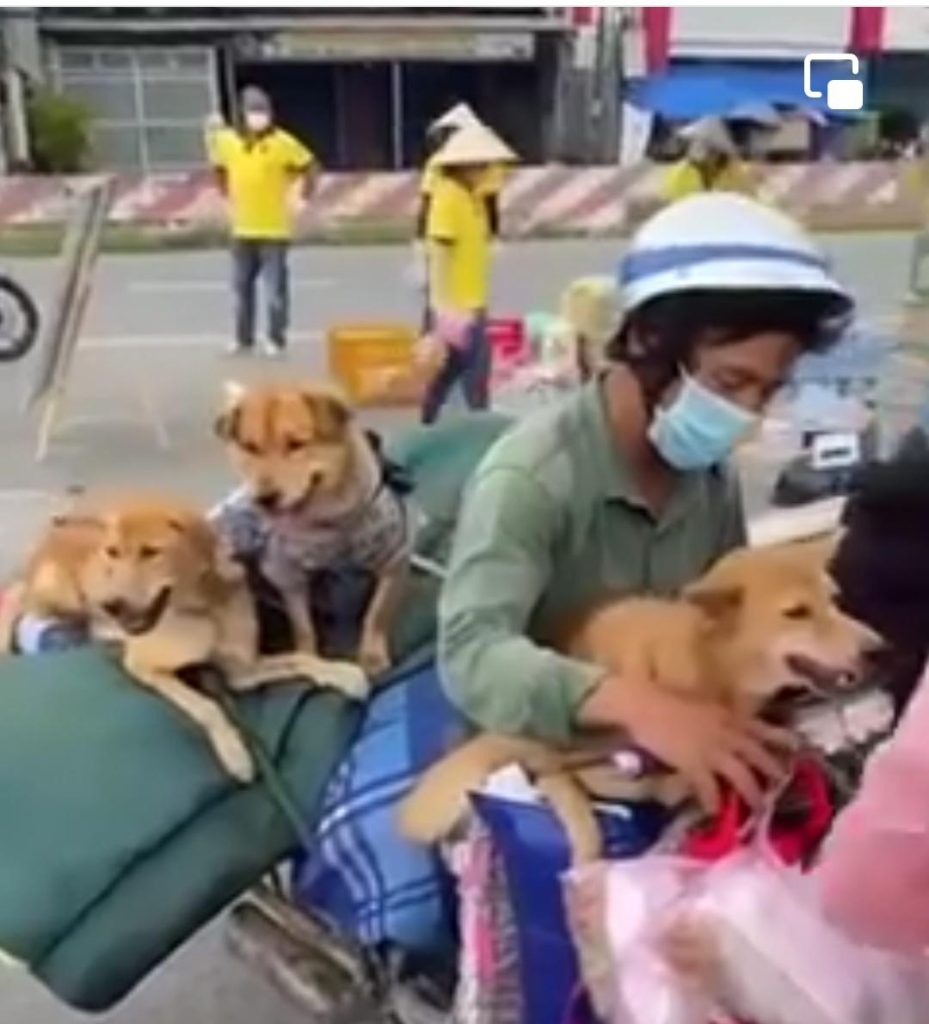 Hình ảnh ông Hùng chạy xe máy chở theo đàn chó và đồ đạc về quê tránh dịch được nhiều người đi đường ghi lại