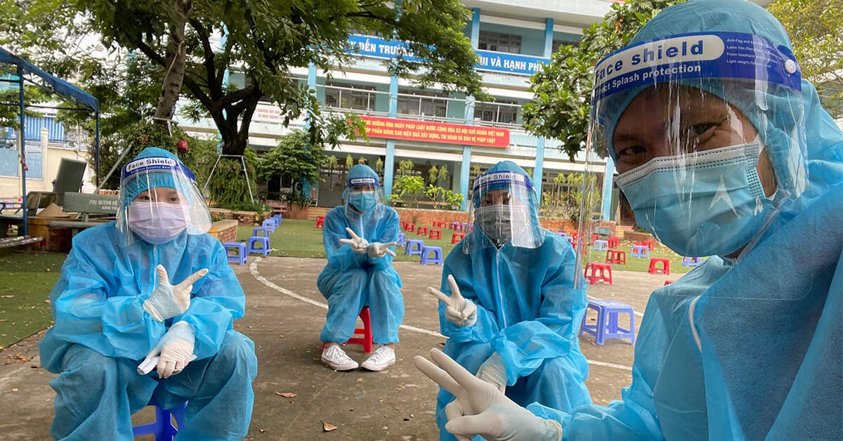 Anh H. còn động viên vợ (chị A., trưởng phòng kinh doanh cùng công ty), em gái T.H (nhân viên phòng công tác sinh viên đại học FPT) và em gái họ N. (sinh viên năm cuối đại học FPT) cùng tham gia làm tình nguyện viên hỗ trợ điểm tiêm vắc xin tại quận Gò Vấp.