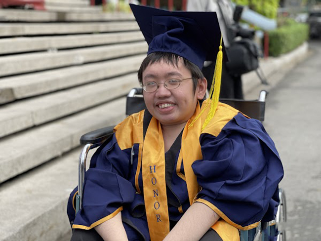“Mẹ em mất đột ngột khi em còn học phổ thông, lúc đó hai cha con đã rất hụt hẫng vì mẹ là người ‘lành lặn’ duy nhất trong nhà, là chỗ dựa cho cha con em. Em đã nghĩ tới việc bỏ học và rơi vào tình trạng chán nản, nhưng bạn bè, thầy cô động viên và có cha hỗ trợ, em mới đi được đến ngày hôm nay. Em muốn dành tấm bằng đại học để tặng cha, người đã vất vả chăm sóc, đưa đón em suốt thời gian qua và gửi lời cảm ơn đến bạn bè, thầy cô, những người đã hỗ trợ em rất nhiều ”, Tuấn chia sẻ.