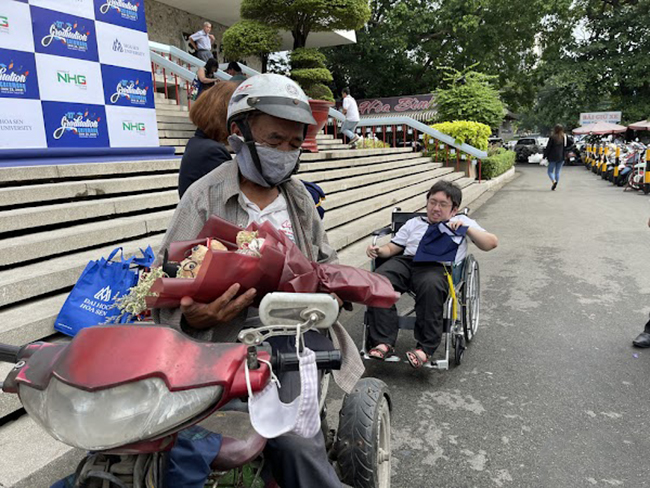 Không thể đi lại bình thường nhưng ông Tiến vẫn luôn đồng hành cùng con trai những năm tháng đến trường trên chiếc xe lăn và chiếc xe gắn máy ba bánh.