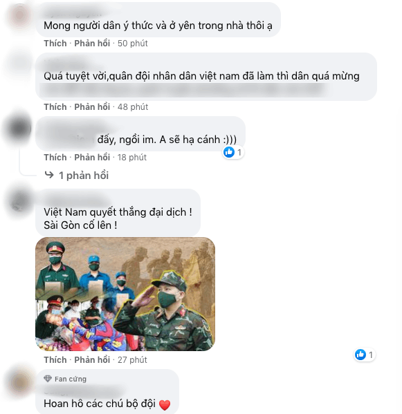Cũng theo Facebooker này, cô không giấu nổi sự xúc động khi nhận được sự hỗ trợ nhiệt tình từ các chiến sĩ, đồng thời bày tỏ sự tin tưởng vào chính quyền: “Sẽ không một ai bị bỏ lại phía sau cả, dẫu phía trước còn rất nhiều gian nan. Bà con yên tâm chống dịch và tuân thủ các chỉ dẫn của nhà nước nhé!”.