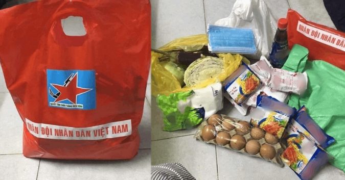 Theo chủ nhân bài đăng, số lương thực được đựng trong chiếc túi đỏ in dòng chữ Quân đội nhân dân Việt Nam cùng slogan Quyết tâm chiến thắng dịch bệnh. Bên trong túi có nước mắm, đường, mì gói các loại, trứng cùng nhiều rau xanh. Ngoài ra, mỗi gia đình sẽ được nhận thêm bao gạo và khẩu trang.