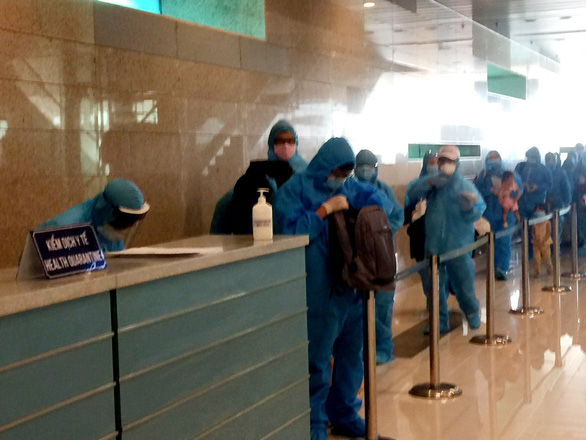 Hành khách từ nước ngoài về chờ làm thủ tục khai báo y tế tại sân bay Cần Thơ – Ảnh: T.L.