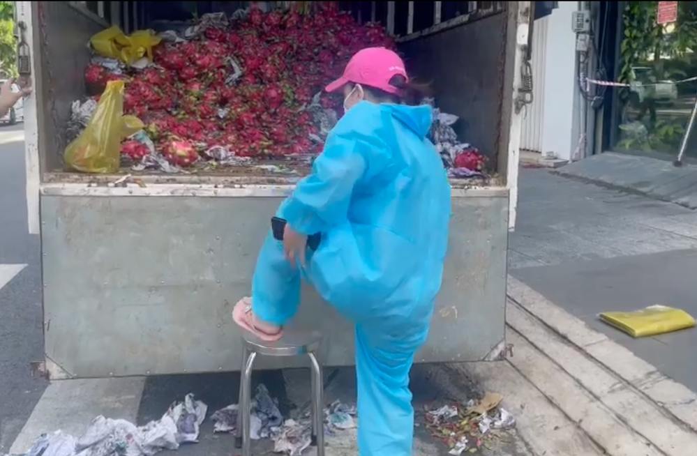 Việt Hương chụp ảnh kỷ niệm cùng thanh long được mạnh thường quân gửi tặng. (Ảnh: FBNV)