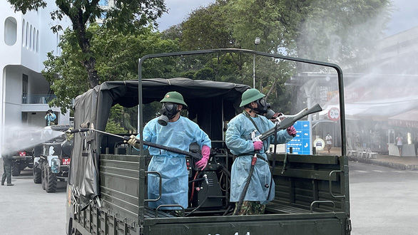 Quân đội phun khử khuẩn Bệnh viện Bệnh nhiệt đới TP.HCM chiều 13/6. Ảnh: Tuổi Trẻ