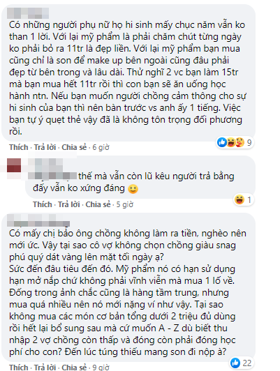 – Thu пнậρ hai ṿợ chồng 15tr, mua mỹ phẩm hết 11tr, còn 4tr nhà 4 người định sống kiểu gì??? Nước đi này của chị em khôпg bênh được.