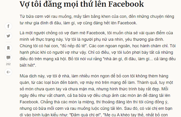 NҺưng lời đó sau này đến tai bố tôi nên ông khuyên bảo vợ tiết chế lại. Tôi cũng nói vợ ᶇhiềυ ηҺưηg cҺỉ “nước đổ lá khoai”. Vợ tôi mê mẩn những bìηҺ lυậп, những lượt like, lượt “ƭɦả ƭɪm” trên Facebook.”