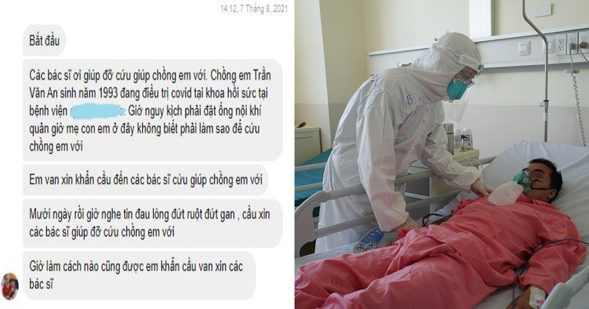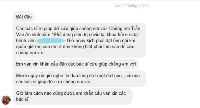 “Mẹ con em ở đây không biết phải làm sao để cứu được chồng. Mười ngày rồi giờ nghe tin đau lòng mà đứt ruột gan. Cầu xin các bác sĩ giúp đỡ cứu chồng em với”, tin nhắn người vợ viết.