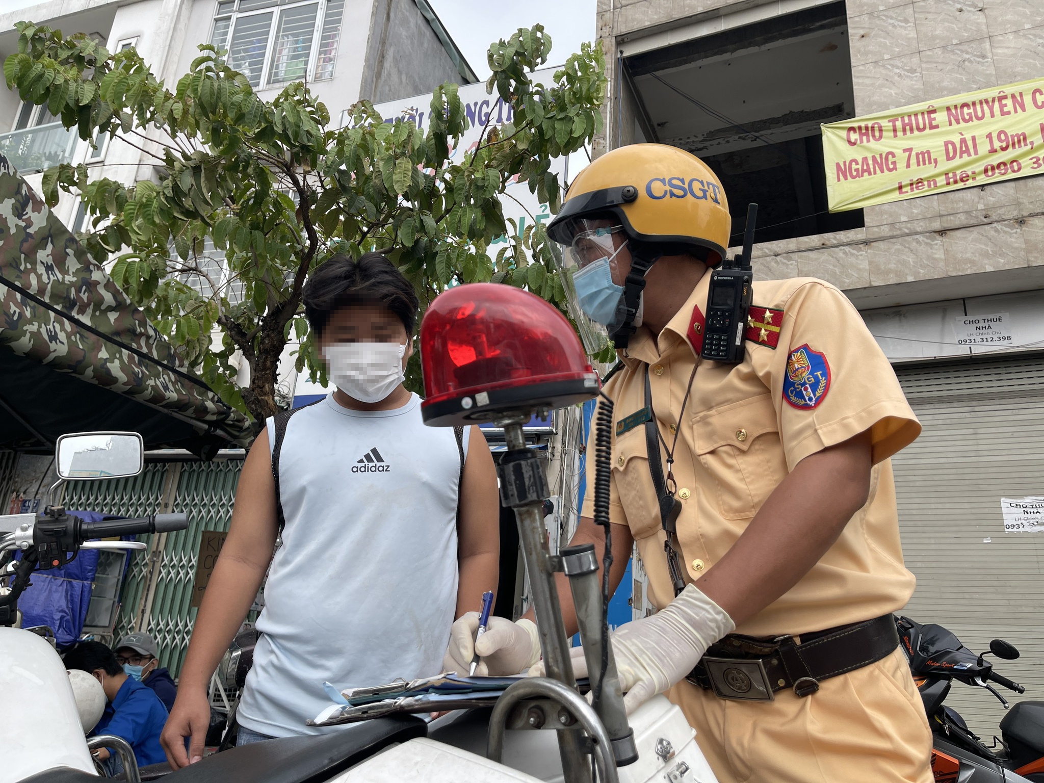 Lúc 7 giờ 45 phút, tổ tuần tra lưu động của Công an Q.Gò Vấp quay trở lại chốt kiểm soát trên đường Phan Văn Trị cùng một nam thanh niên không trình bày được lý do ra đường, không đội mũ bảo hiểm. Nam thanh niên này đã bị lập biên bản phạt hơn 2 triệu đồng.