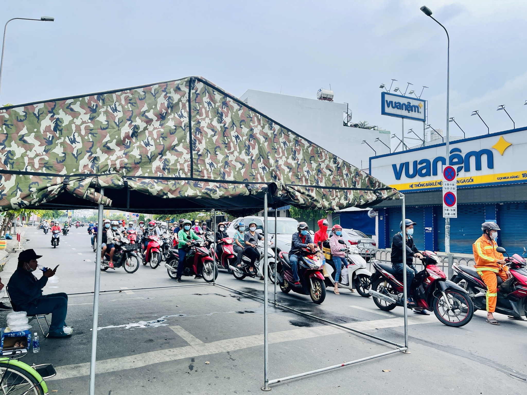 Tại chốt Phan Văn Trị (đoạn Q.Gò Vấp), lúc 7 giờ 15 phút, lực lượng trực chốt đều ngồi phía trong lều, không kiểm tra giấy tờ cá nhân của người đi đường. Lượng xe lưu thông từ Q.Gò Vấp hướng ra Phạm Văn Đồng vẫn còn tương đối đông.