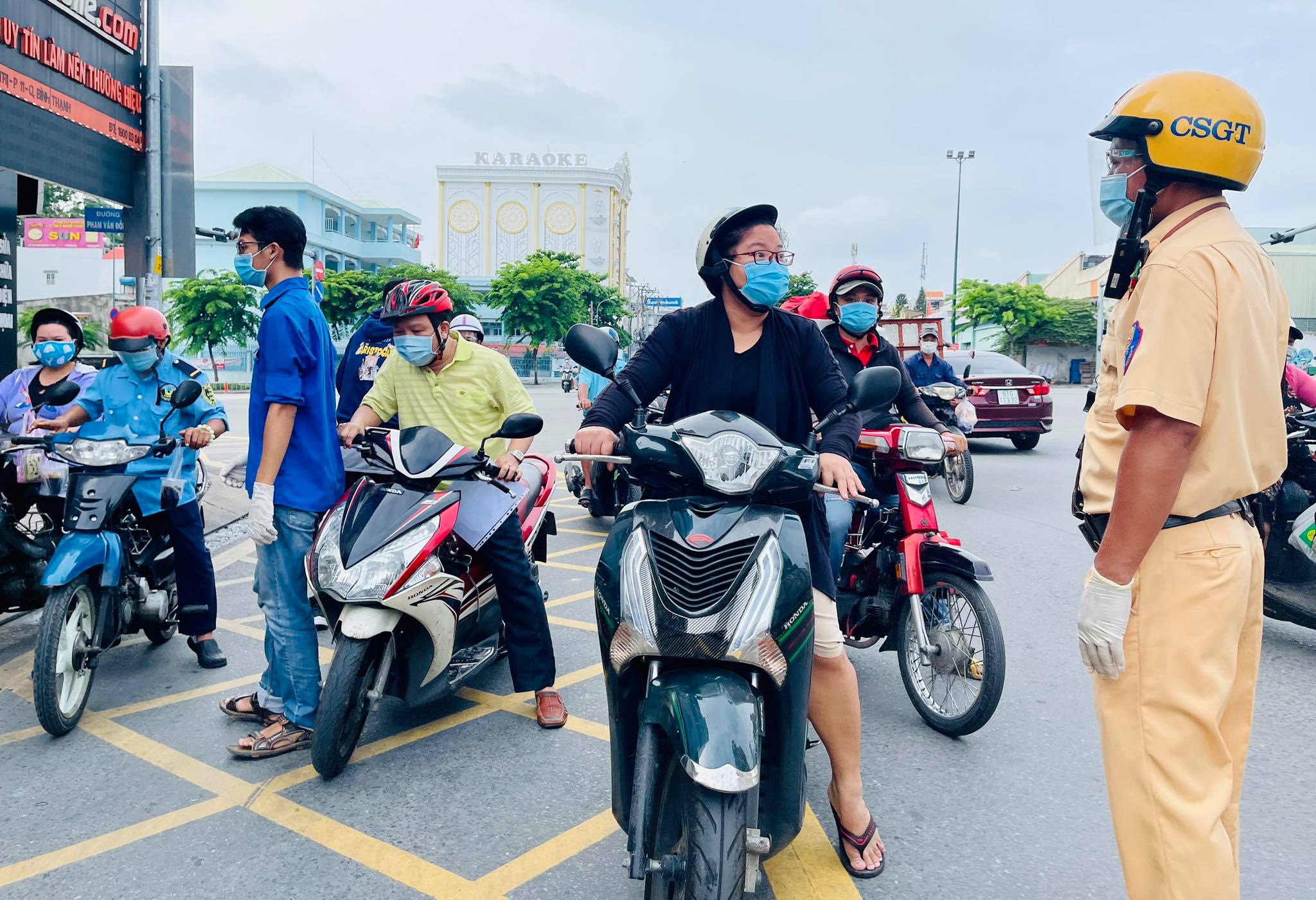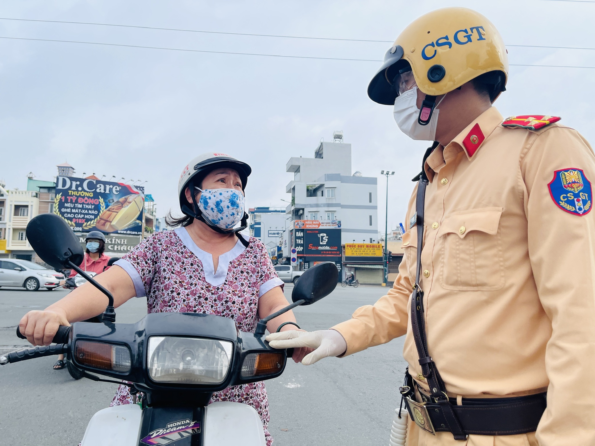 Bà T.T.K. chạy xe máy về hướng Q.Bình Thạnh cho hay: “Tôi đi thăm bạn ốm ở chợ Bà Chiểu”, bà K. cũng không mang theo giấy tờ nào nên được CSGT yêu cầu quay đầu xe và nhắc: “Cô ơi, đang thực hiện Chỉ thị 16 hạn chế đi lại. Cô thông cảm quay về giúp con với nha”.