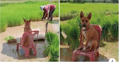 Mới đây một chú chó đã thu hút sự quan tâm của nhiều người khi được đặt ngồi ở giữa cánh đồng, lại còn có ô che nắng, trong khi chủ đang lao động vất vả khiến không ít người phải tò mò.