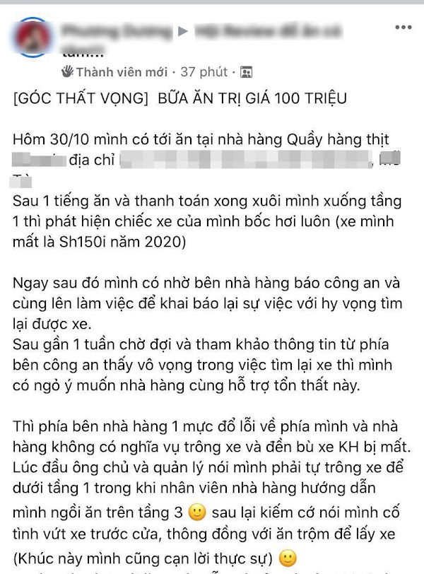 Do cách xử lý thiếu thiện chí của nhà hàng nên cô gái đã đăng bài “bóc phốt”, đồng thời cũng là lời nhắc nhở đến nhiều người khi đi ăn ở hàng quán để tránh gặp chuyện xui rủi như mình. Việc các quán ăn có bảo vệ trông xe nhưng thỉnh thoảng vẫn xảy ra những sự cố đáng tiếc như cô gái trong câu chuyện trên.
