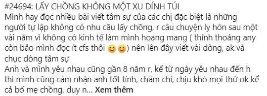 “Mình hay đọc nhiều bài viết tâm sự của các chị đặc biệt là những người tự lập không có nhu cầu lấy chồng, rồi câu chuyện ly hôn sau một vài năm vì không có kinh tế làm mình hoang mang (thỉnh thoảng anh người yêu còn bảo mình đọc ít thôi) nên lên đây viết vài dòng, à vài chục dòng tâm sự.”