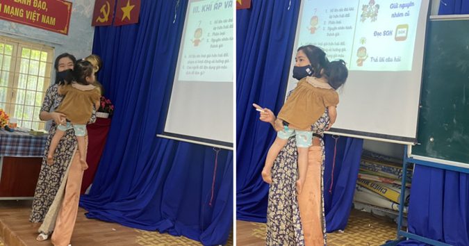 Cô T.T.K.C. bồng con trong tiết dạy chiều 10-3 – Ảnh: T.A.