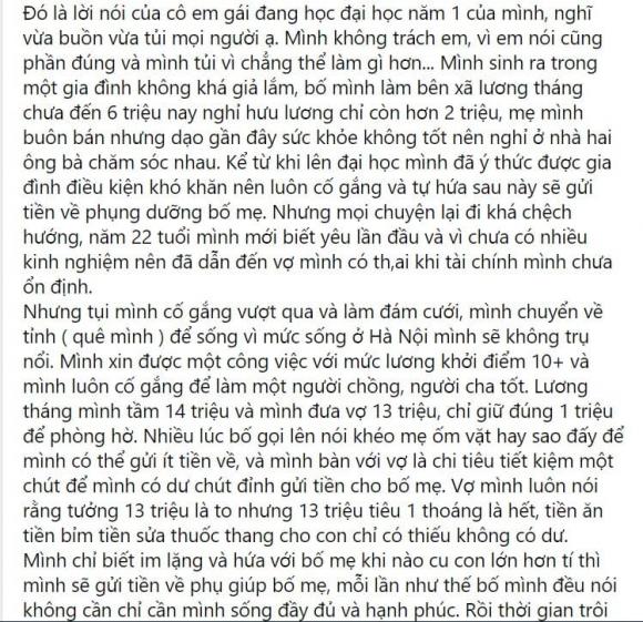 Tâm sự của anh chàng làm lương 14 triệu/tháng nhưng không thể gửi tiền về quê phụng dưỡng bố mẹ do đưa hết cho vợ nhanh chóng trở thành đề tài gây nhiều tranh cãi trên mạng xã hội.