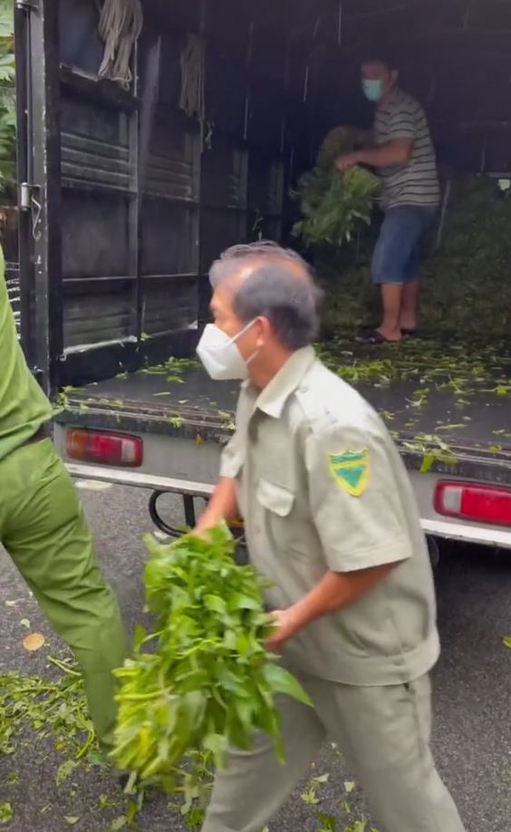 Anh công an hỗ trợ mọi người chuyển rau. (Ảnh: Chụp màn hình)