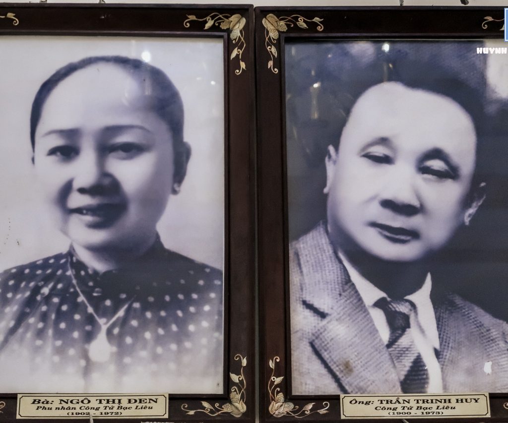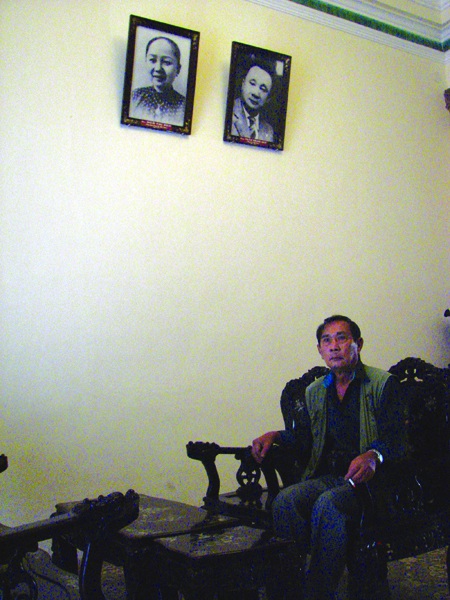 Ông Trần Trinh Đức bên chân dung của cha mẹ (Công tử Bạc Liêu và vợ) trong khách sạn Công tử Bạc Liêu ngày nay.