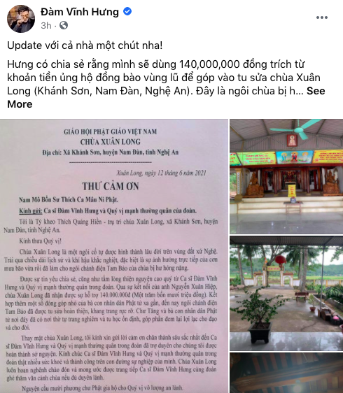 Theo như ‘Mr. Đàm’ thông báo, anh đã trích ra 140 triệu từ quỹ cứu trợ để xây dựng lại ngôi chùa Xuân Long (Khánh Sơn, Nam Đàn, Nghệ An) vì cơn lũ vừa qua đã làm nơi đây bị hư hỏng nặng, chưa kể các tăng ni trong chùa cũng là người dân vùng lũ nên nam ca sĩ quyết tâm thực hiện: “Công việc tu sửa đã hoàn thành, nhìn khang trang hơn, sạch đẹp hơn rất nhiều. Hưng cảm ơn tất cả những tấm lòng của khán giả đã đóng góp cho Hưng, cùng Hưng làm điều ý nghĩa này nha”.